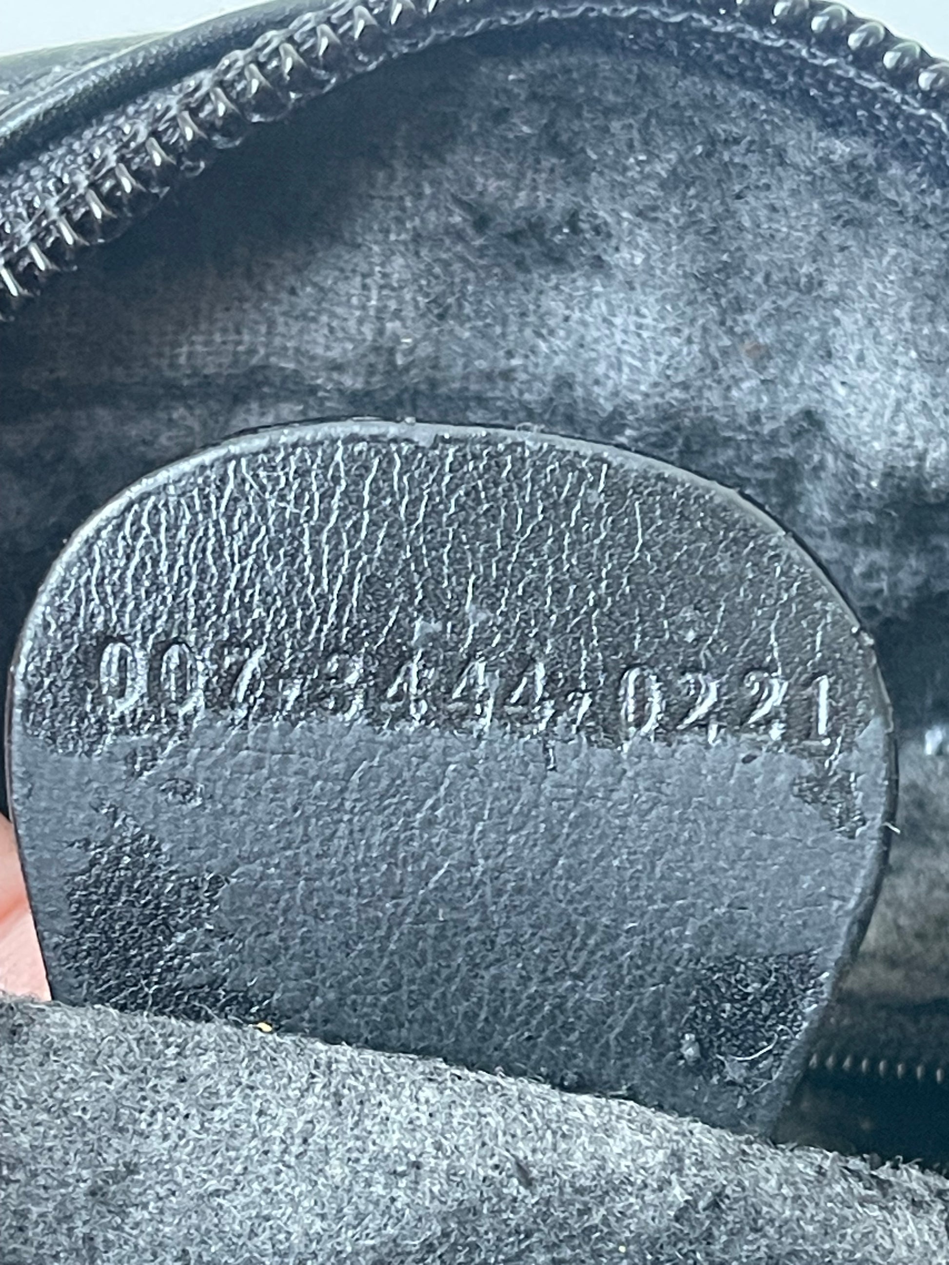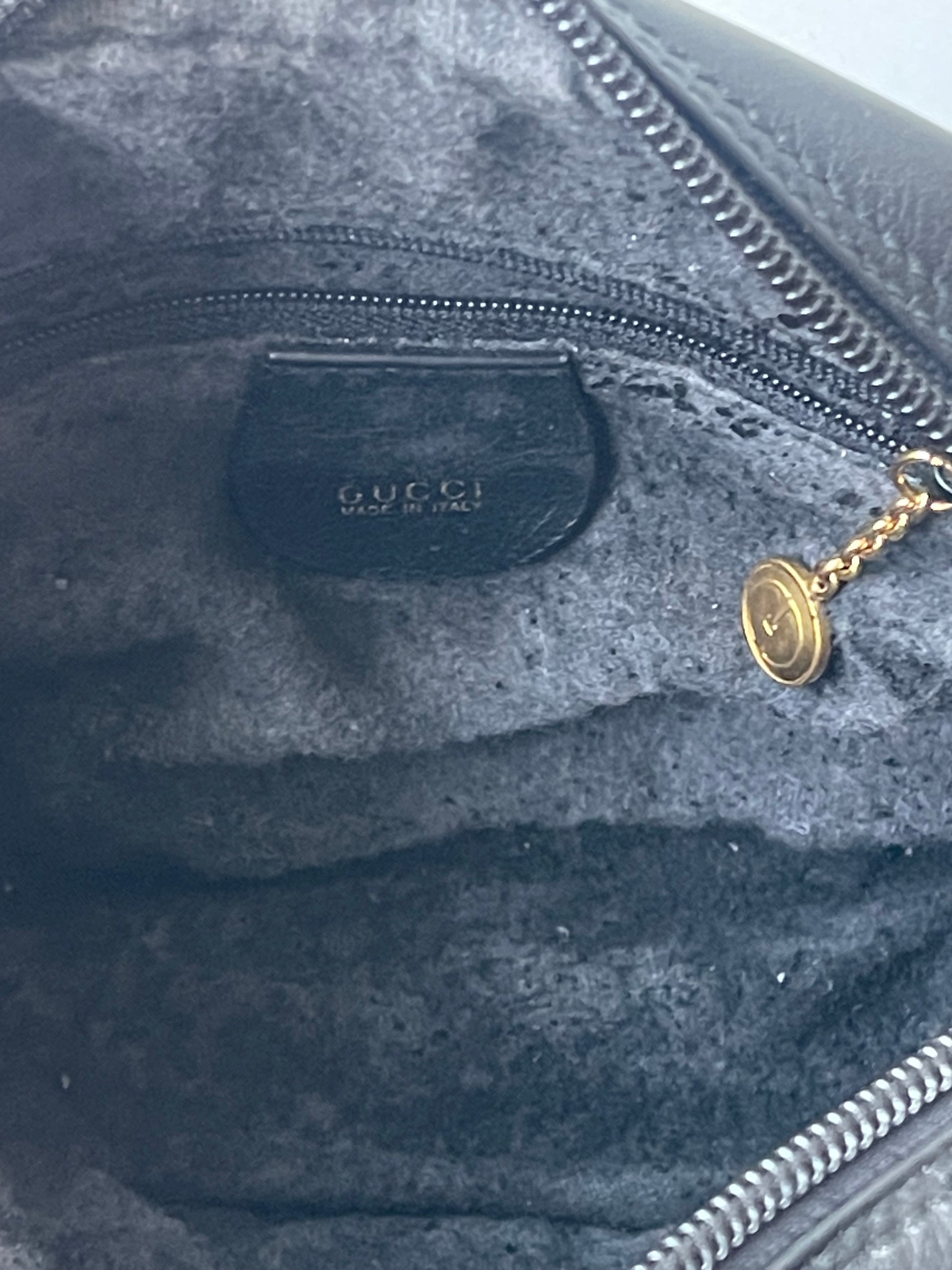 Binnenkant: Voering is verouderd en brokkelig (een veel voorkomend kenmerk bij Gucci-tassen uit deze periode).