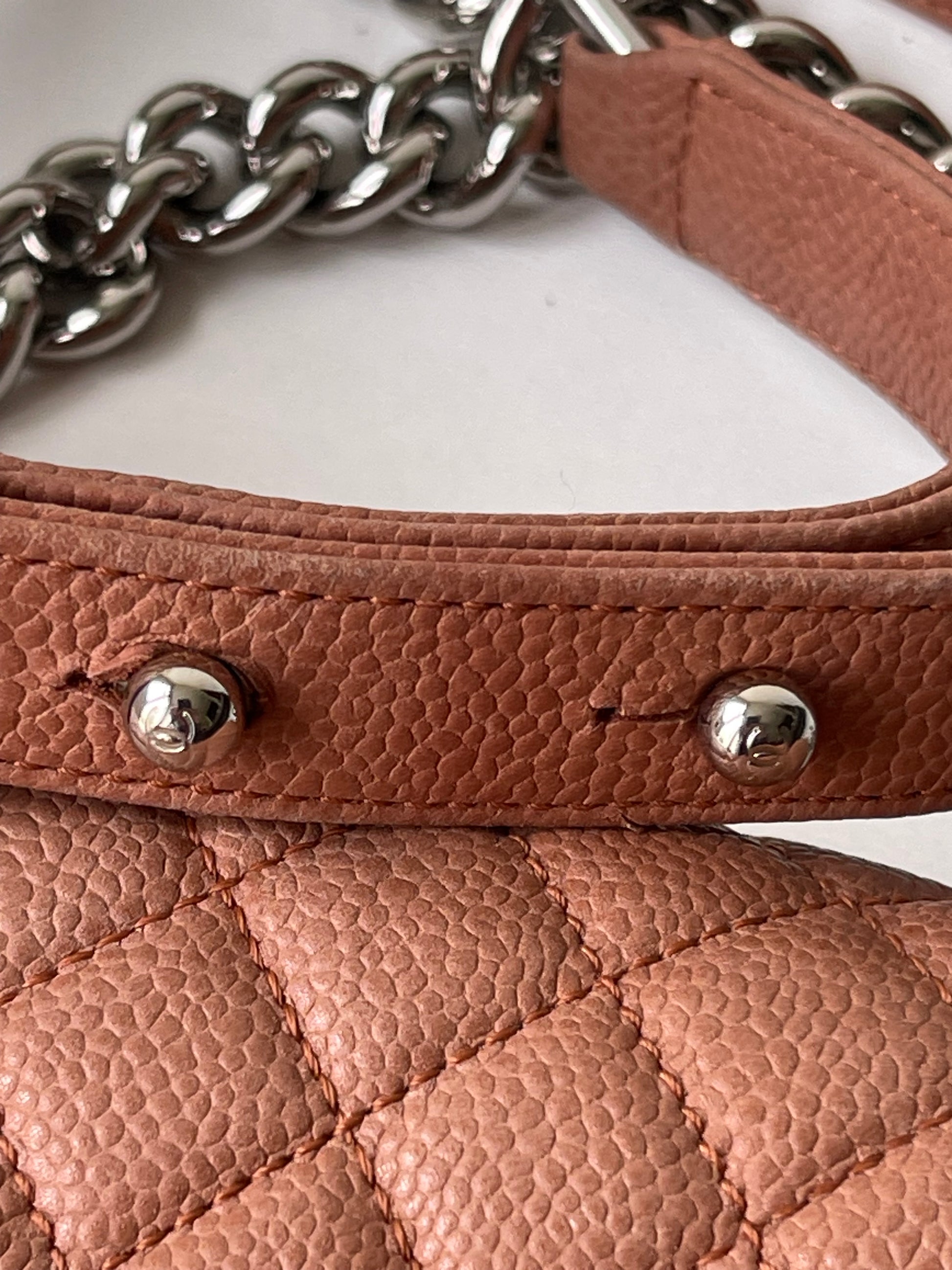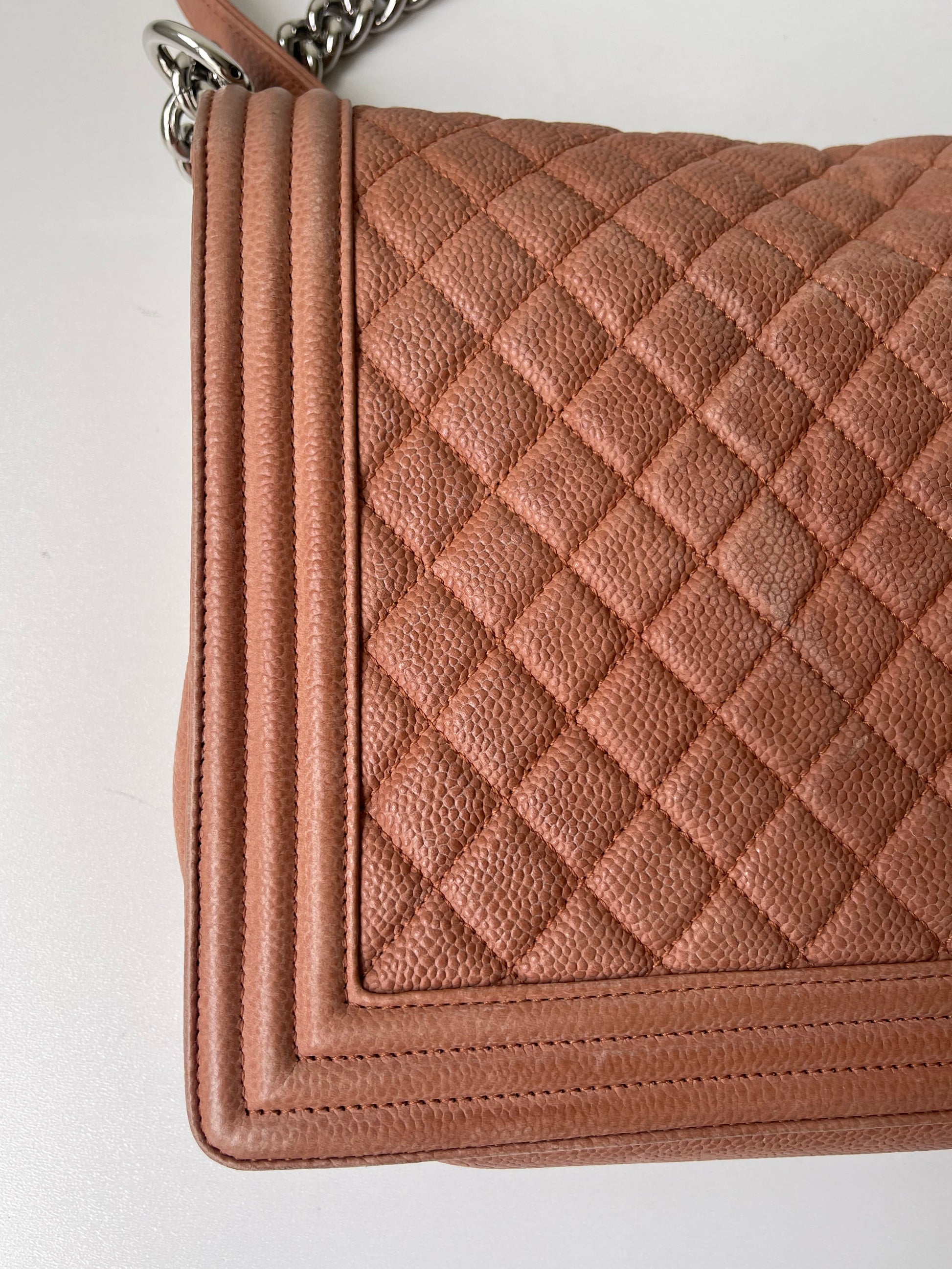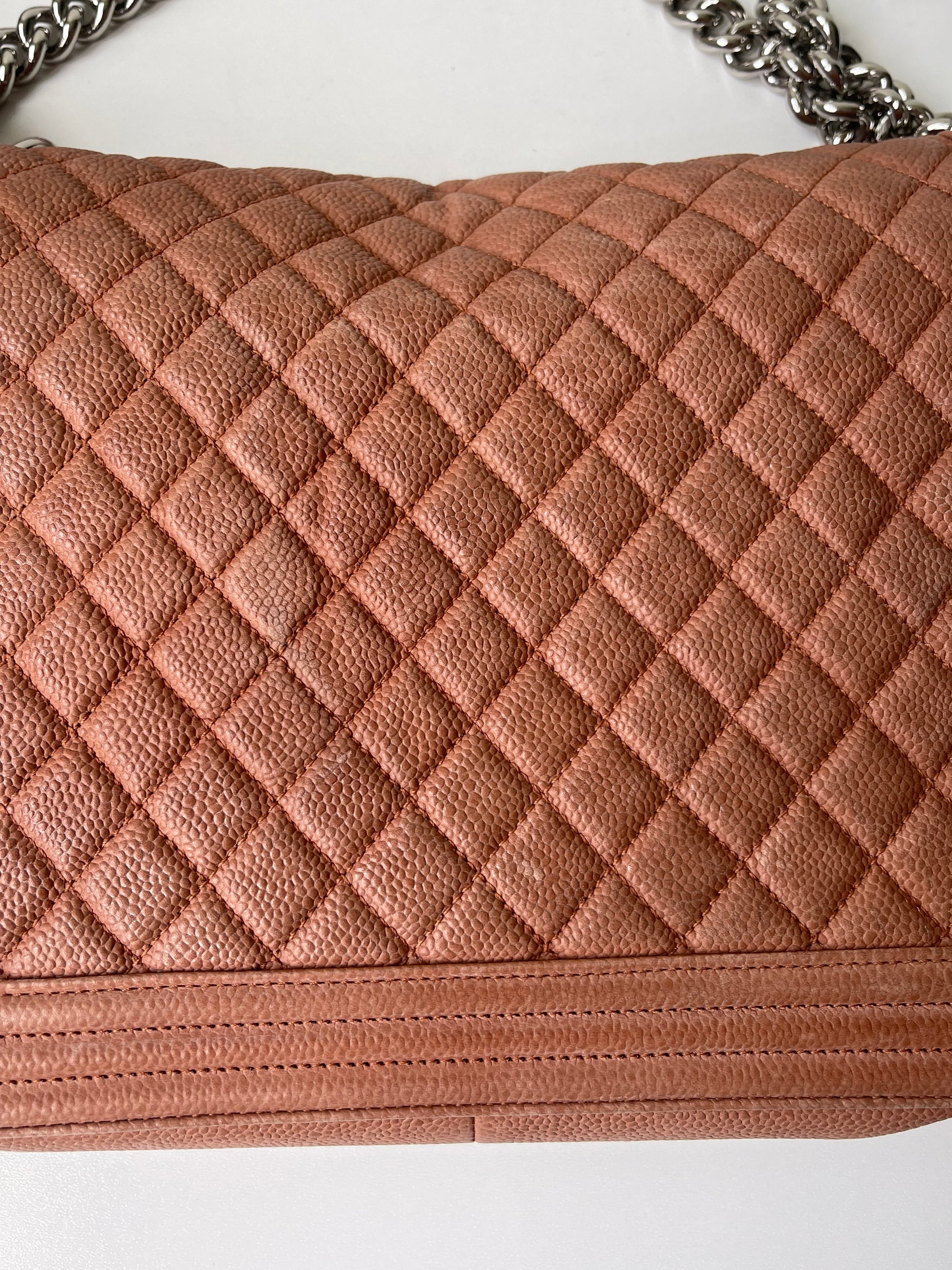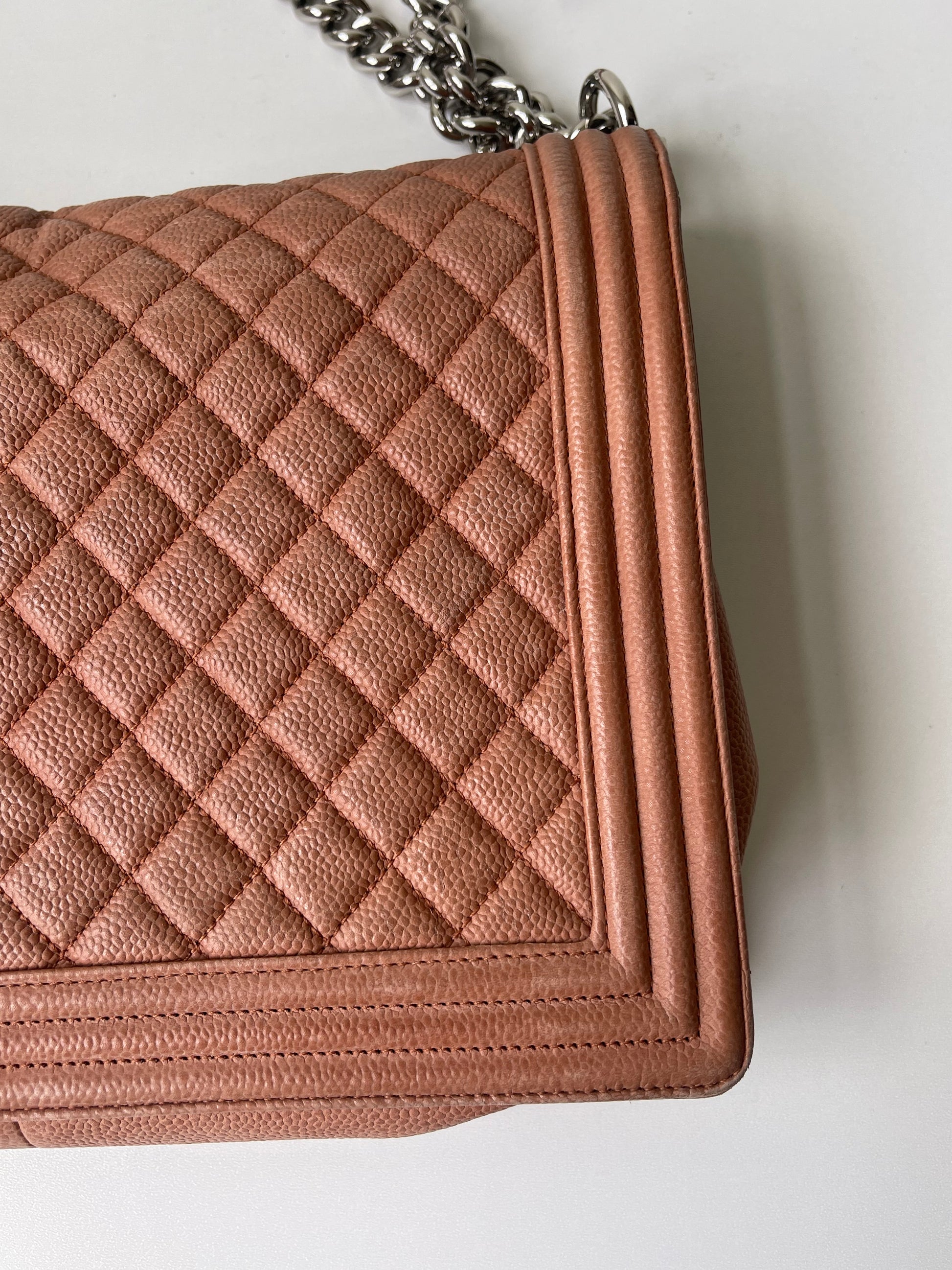 Deze Chanel Boy Bag in de New Medium-maat (30 cm) is een zeldzaam en gewild collector’s item. Uitgevoerd in stevig en duurzaam caviar-leer in een unieke zalmroze tint, straalt deze tas pure klasse en verfijning uit. De tas is afgewerkt met aged silver-tone hardware (ruthenium finish) en het iconische doorgestikte patroon, gecombineerd met de bekende CC-druksluiting op de voorkant.