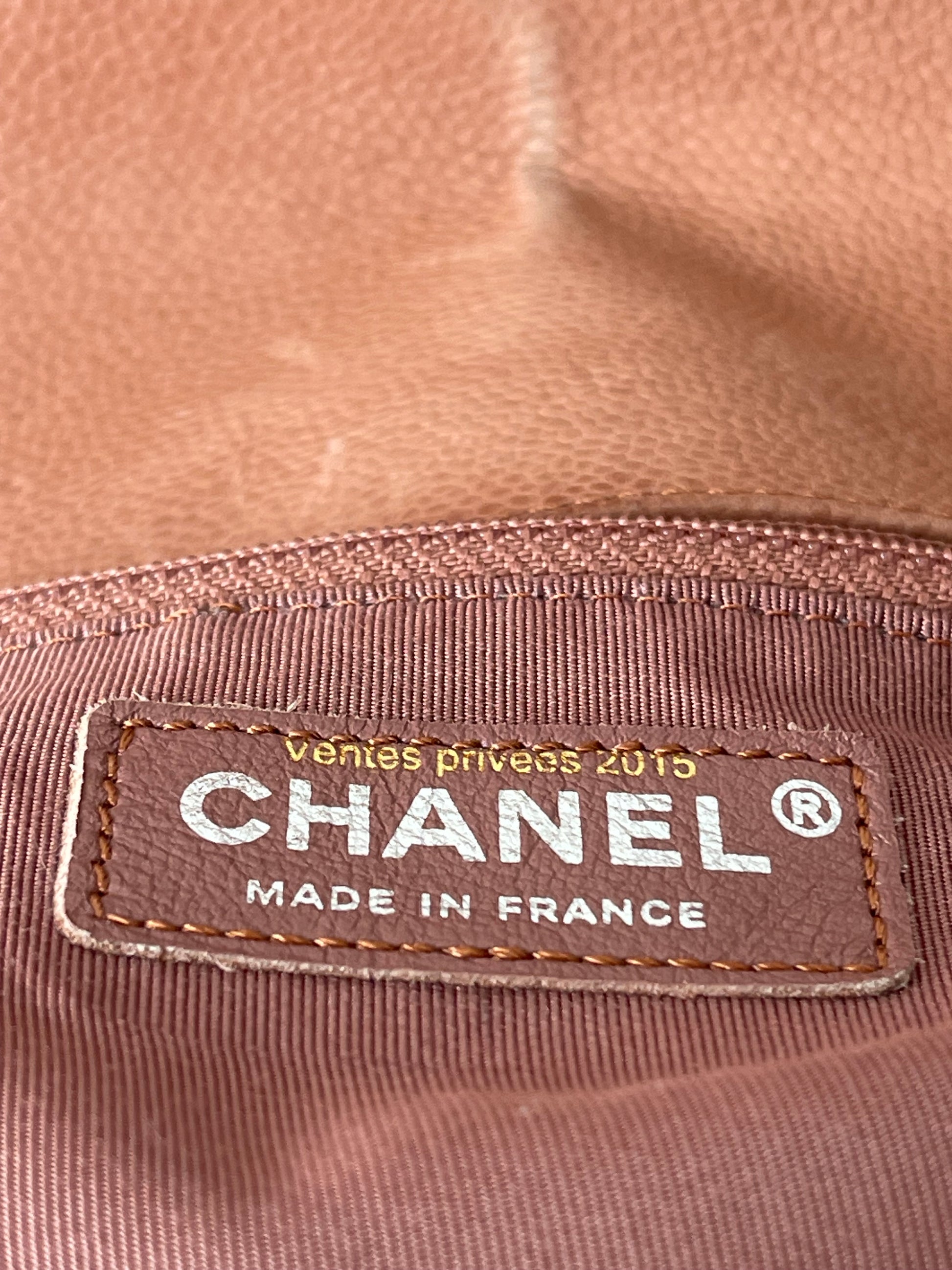 De tas draagt een lederen label met “CHANEL – Made in France” en “VENTES PRIVÉES 2015”, wat aangeeft dat dit model is verkocht tijdens een exclusieve privéverkoop in 2015. Dit benadrukt de authenticiteit en de exclusiviteit van de tas.